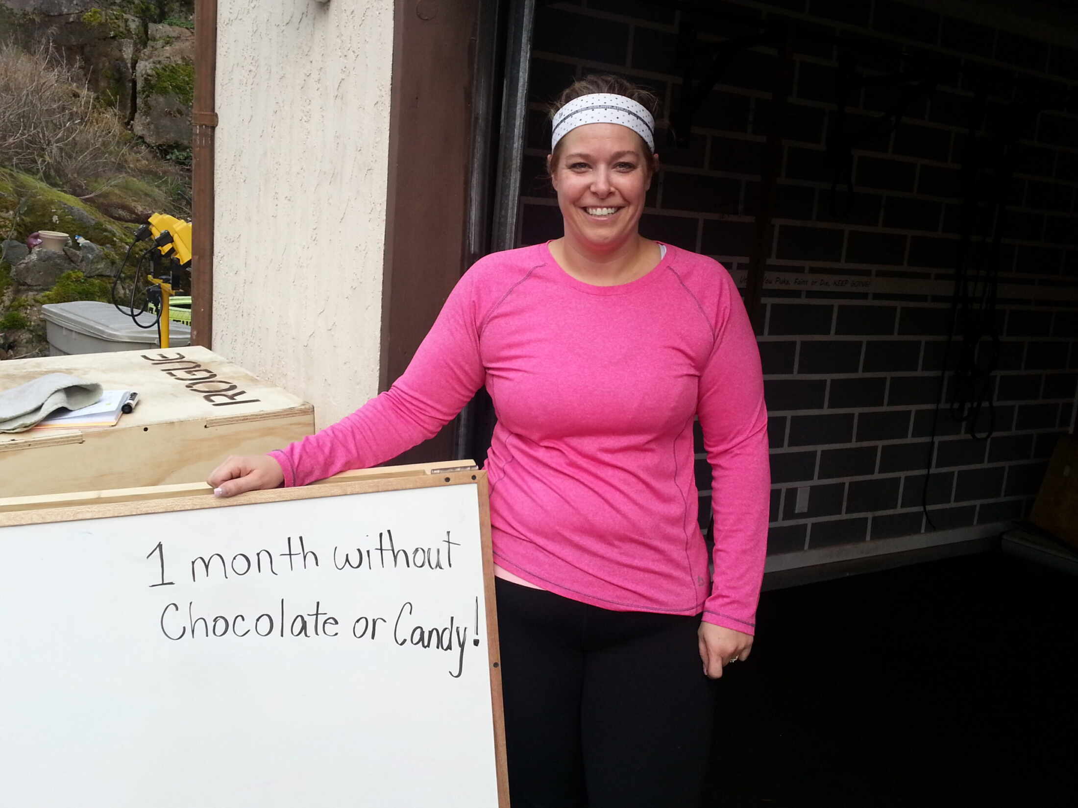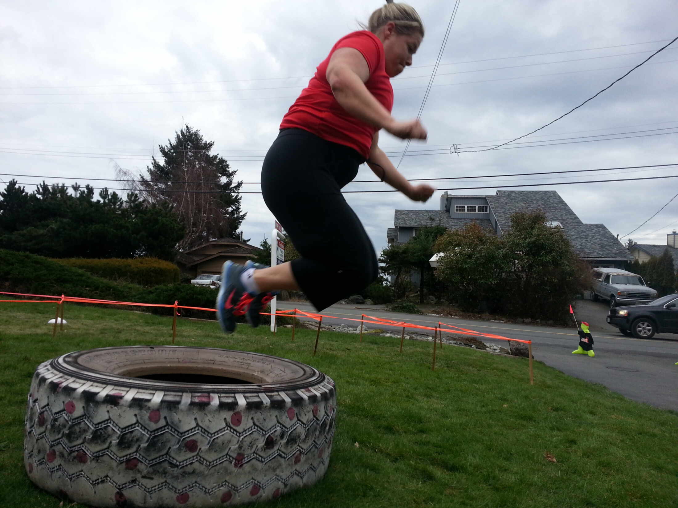 When I see Michelle all I think of is WOW…her transformation has been amazing! Michelle joined Follow the Leeder gym in the summer of 2012, and has been a force of determination ever since. I remember when she first started and was only able to do step ups on the box, but so badly wanted to do a box jump…and now she’s fearlessly jumping over tires and boxes. Michelle is a machine, when she sets her mind to do something, she succeeds. She went from walking to running the kids to school, to 5 kms runs on the Goose and then we ran the Times Colonist 10kms together, she was amazing! This past summer Michelle ran, crawled and climbed her way to the finished of her first Mud race with Mel’s Mudders. This past September, she started the Advanced Crossfit training classes on Wednesday night’s, preparing for the Crossfit Open competition this March. She can Clean, Snatch and Dead-lift some pretty heavy weight. Just this last week, Michelle got her first pull up…pretty frick’n awesome! Since Michelle started she last lost 75lbs…more than the weight of all those Wall Balls in the picture!